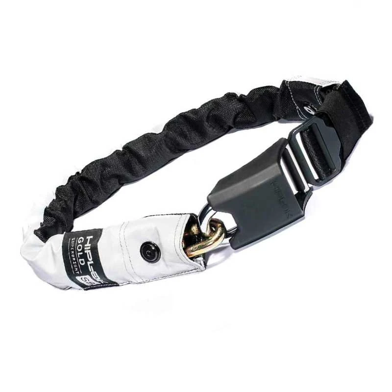 Kaum zu glauben, aber die 2,4 kg sind kaum spürbar an der Hüfte. Das Gewicht verteilt sich optimal und zentral in der Körpermitte. Keine Belastung des Rückens, keine extra Tasche! Die Ketten sind weich ummantelt mit strapazierbarem Nylon und sind system ohne Druckstellen zu tragen. Das Schloss muss beim Tragen um die Hüfte nicht verschlossen werden (so kann es im Notfall auch ohne Schlüssel schnell abgenommen werden).