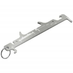 Schick verchromt, 28 g leicht kommt diese Kettenlehre zwar wie ein Schlüsselanhänger daher, ist aber in Wirklichkeit ein nützliches Multitool, das mit dem Schlüsselring wunderbar in der Biketasche fixiert werden kann. Neben der Kettenlehre kannst du die Kette auch einhaken und zum Auswechseln von Kettengliedern fixieren. Eine Kerbe dient außerdem als Hebel zum Öffnen von Ventilkernen. Und wenn du auf deiner Tour einmal anhältst um dich zu erfrischen – ein Flaschenöffner ist natürlich inklusive!